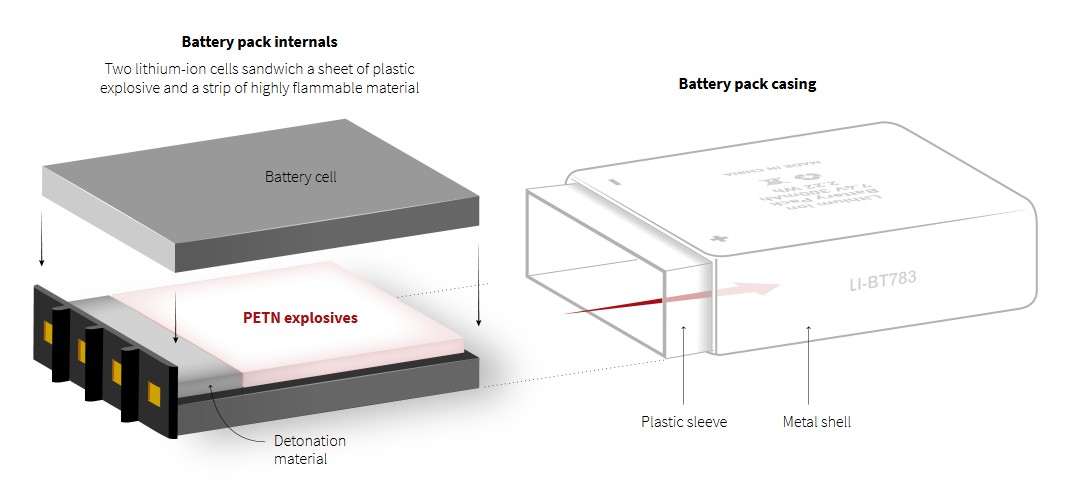 Cada pager contaba con unos pocos gramos de explosivo plástico. Había sido camuflado de tal forma que al abrir uno de los pagers no pudiera ser notado y aun con rayos X la densidad estuviese perfectamente distribuida en la batería para que no se pudiera notar la diferencia.