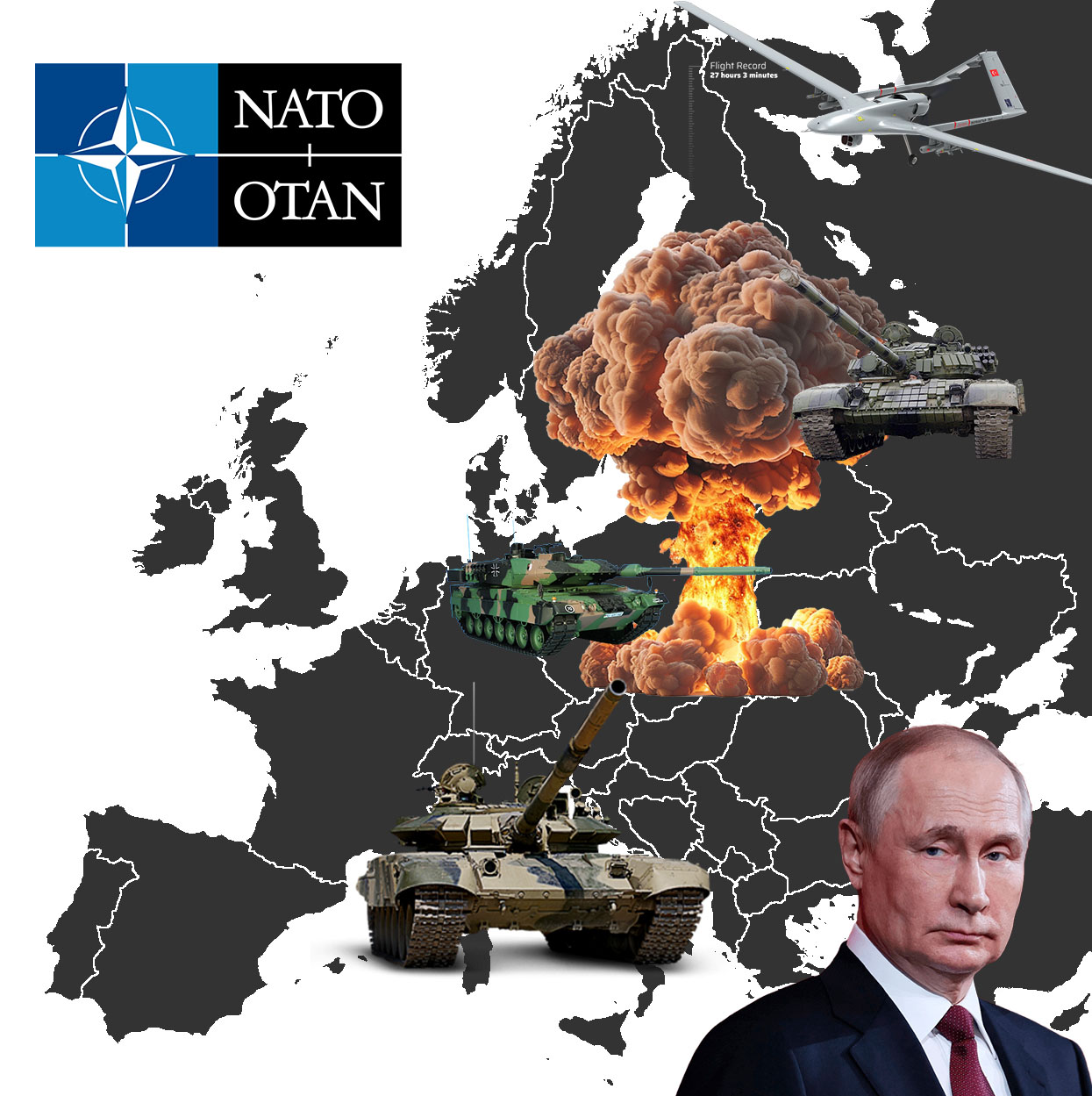Primero que nada definamos un poco el contexto de esta fantasía bélica. La OTAN está siendo abandonada por Donald Trump. El presidente norteamericano es "empleado" de Moscú, hace tiempo que Vladimir Putin tiene "algo" que le sirve para llevarlo de las narices a su gusto y el naranja cada tanto responde a las órdenes de su amo ruso.