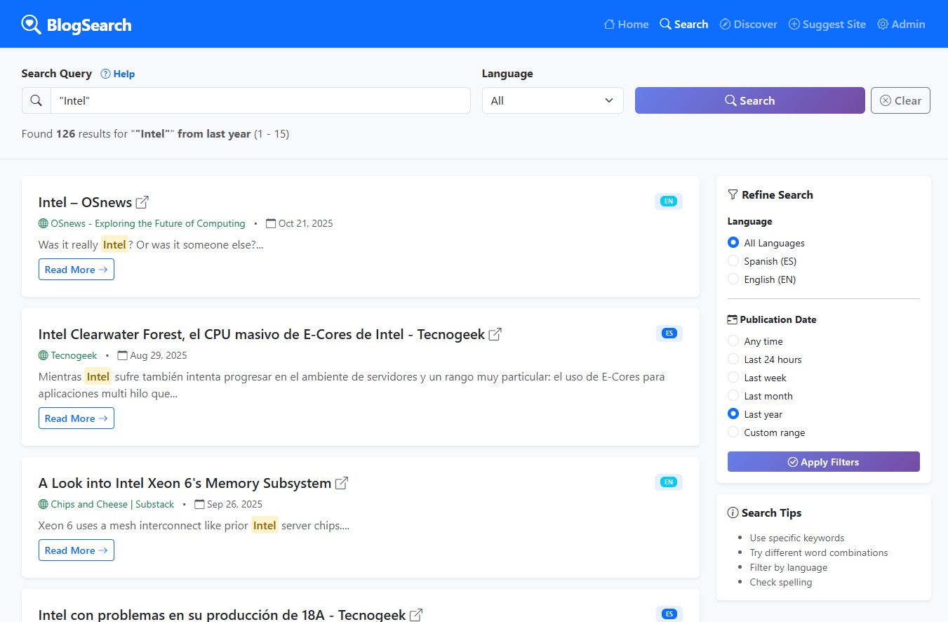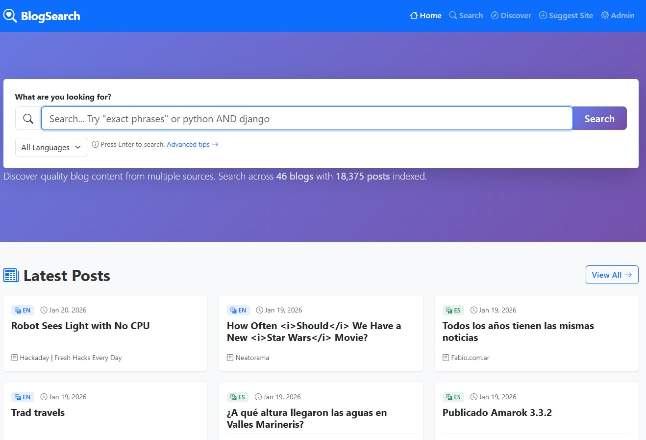 Pueden ingresar al buscador aquí, apenas tiene 46 sitios indexados y unos 20.000 artículos, obviamente el sitio más indexado es el mío porque lo usé de testing 😁, pero si me dan una ayudita puedo aumentar más la cantidad y variedad.