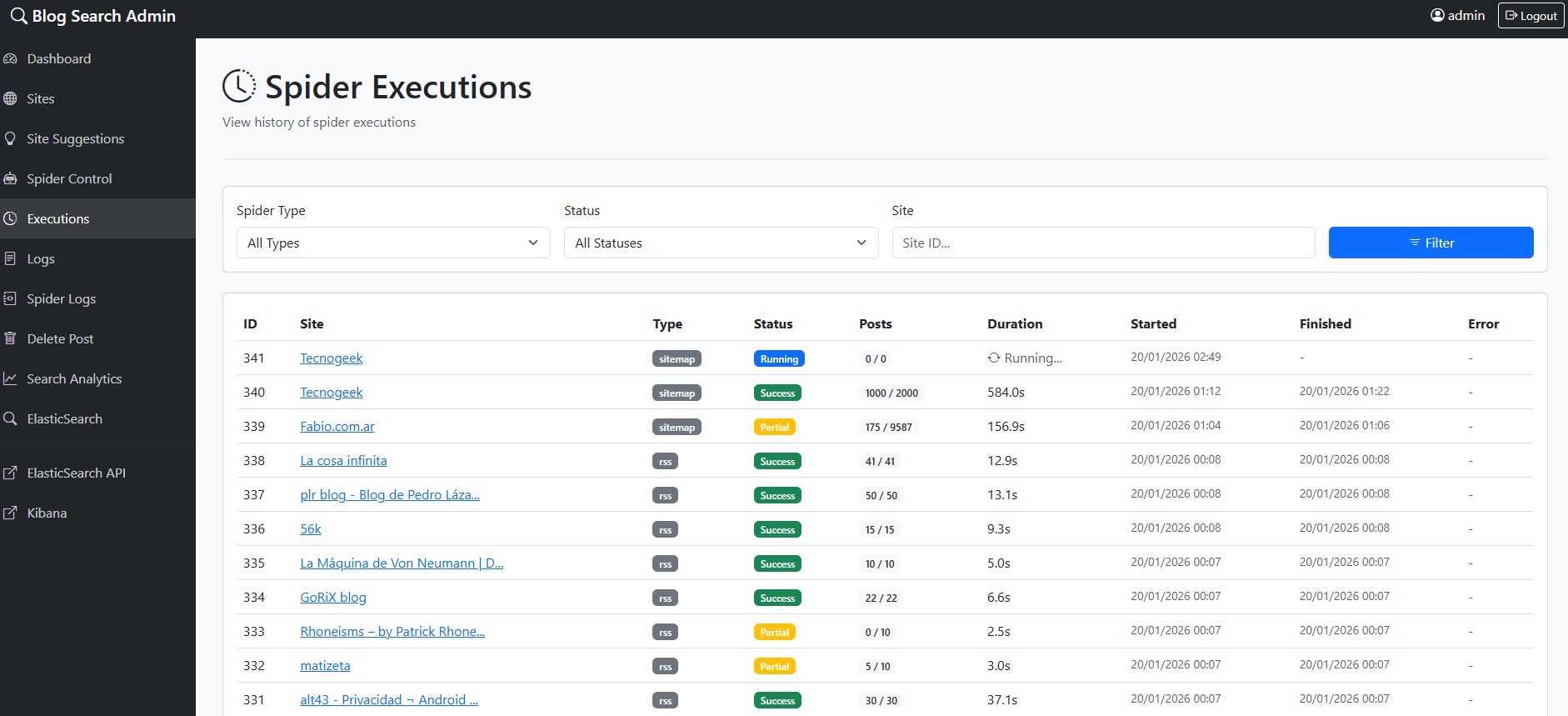 Por otra parte el admin, donde administro el sitio y disparo escaneos, los mismos los hice evitando el uso de exec, simplemente dejan un aviso al spider y cada minuto se analiza si hay un pedido nuevo.