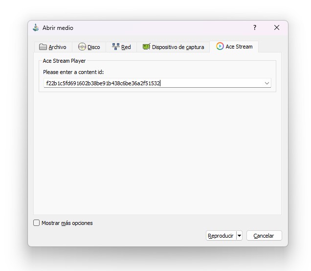Abriendo el Ace Player simplemente van al menú de Medios -> Open Ace Stream Content ID y pegan el hash: