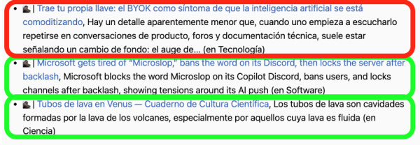 Ojo, los que tienen ya un resumen (en verde) , son buenísimos y te da idea de lo que podés llegar a leer al abrirlo, pero algunos otros tiene la descripción idéntica al primer párrafo del contenido del link y muchas veces es solo una introducción que no da mucha info (caso en rojo)