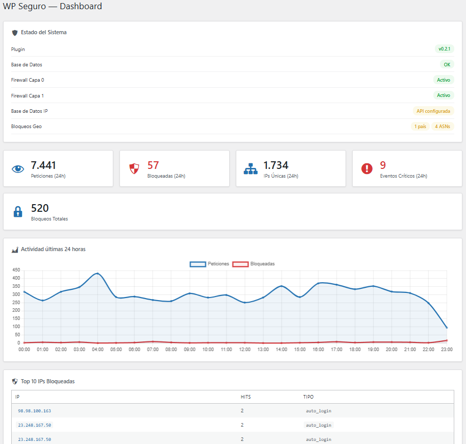 Para cerrar el caso instalé un plugin que vengo armando para seguridad, funciona como Wordfence, pero es mío y tiene otras características que aprendí en mi propio blog sobre qué hacen cuando te quieren reventar un sitio.