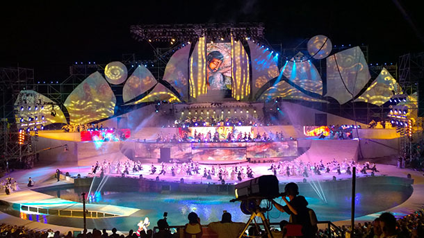 A la noche del sábado era la "Fiesta" en sí, es el Acto Central en el teatro griego «Frank Romero Day», no se cuanta capacidad tiene, serán unas 20.000 personas pero hace mucho que no veía un show de estas características a full completamente lleno.