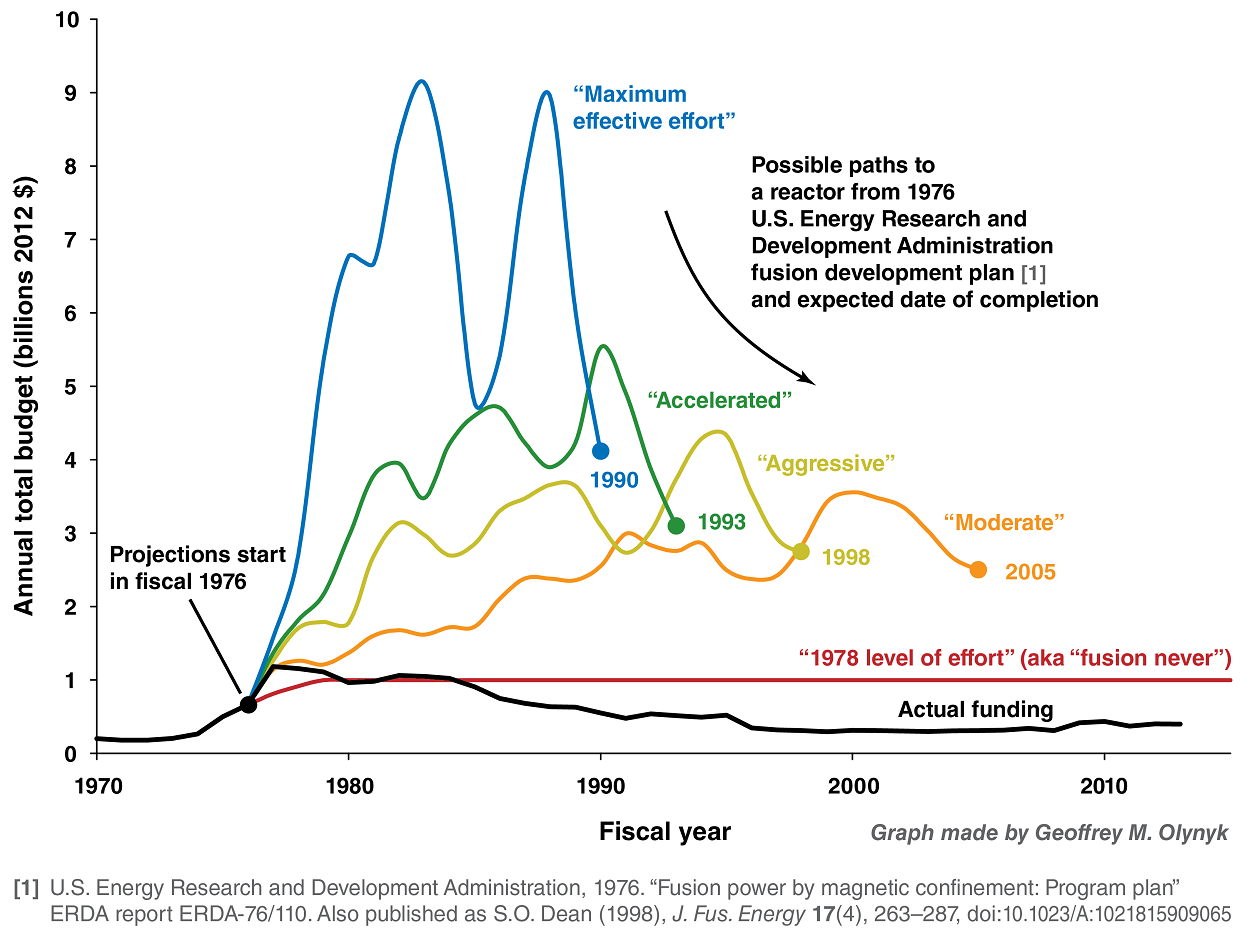 El gráfico que vemos pertenece a Geoffrey M. Olynyk , es de 2012 y resume cinco proyecciones presupuestarias realizadas en 1976 para la financiación de la investigación en fusión en EEUU.