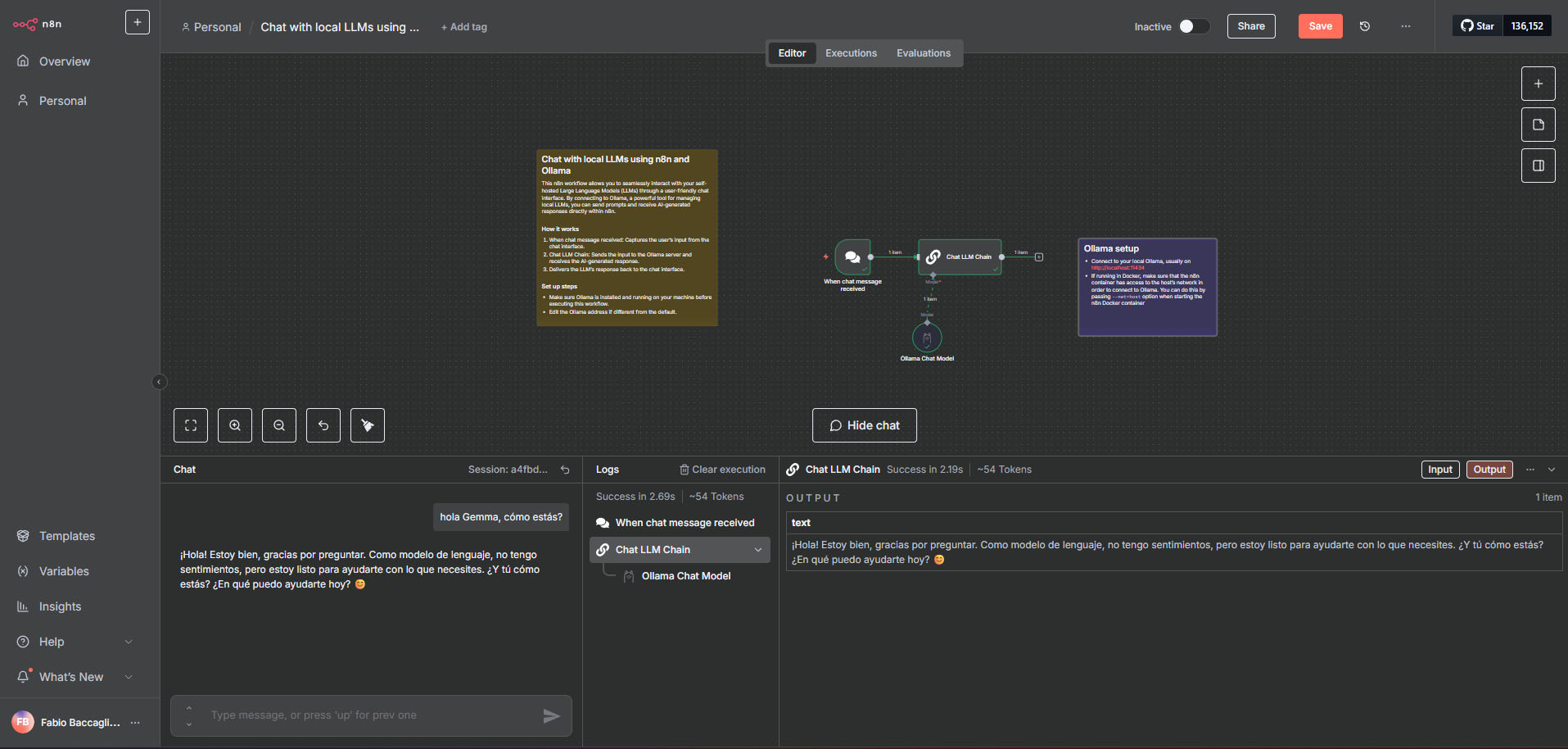 Aquí la prueba de un workflow simple para testear que ollama y n8n se hablan: